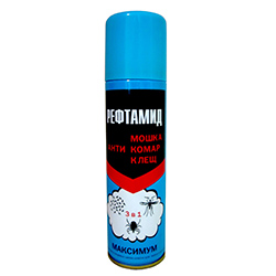 Аэрозоль Рефтамид Максимум 3 в 1 от комаров, клещей, мошки - высокоэффективный, универсальный препарат для защиты людей от нападения комаров, мошки, лесных и клещей. Содержит высокоэффективный действующий компонент, обладает запахом ванилина, сохраняет своё действие в течении длительного времени. Надежно работает в любой местности.